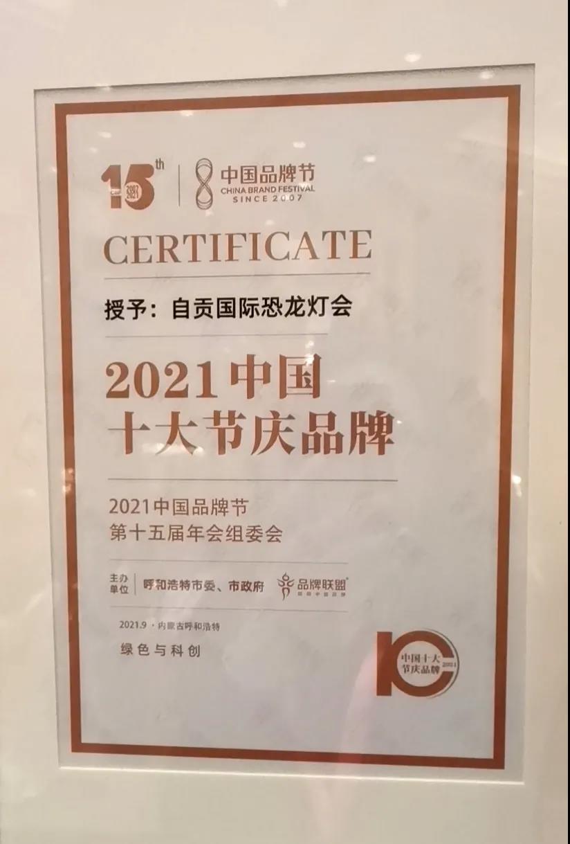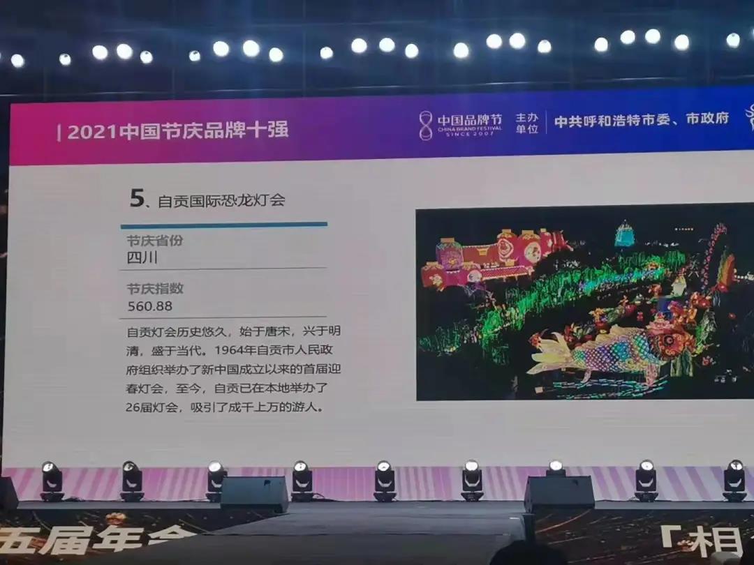 9月11日,2021中国品牌节第十五届年会在呼和浩特市隆重举行。当晚,在年会举办的荣耀盛典上,中国品牌节组委会揭晓了“中国十大节庆品牌”的评选结果,自贡灯会以综合指数560.88分的高分入选,荣登“中国十大节庆品牌”。