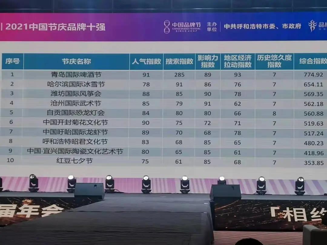 “中国十大节庆品牌”系中国品牌节首次设立的奖项,品牌评估专家组为真实客观反映节庆品牌现状,弘扬中国优秀文化,重塑中国节庆品牌的价值贡献,先后收集国内500余种历史悠久、脍炙人口的节庆活动,评估其在行业中的领导力、市场表现、国际影响力、大众认知度和品牌美誉度等多种指标,对中国节庆活动进行了排名。自贡国际恐龙灯会分别以人气84、搜索指数80、影响力指数80、地区经济拉动指数66、历史悠久度指数8,综合指数560.88位列排行榜第五位。青岛国际啤酒节荣登排行榜榜首。